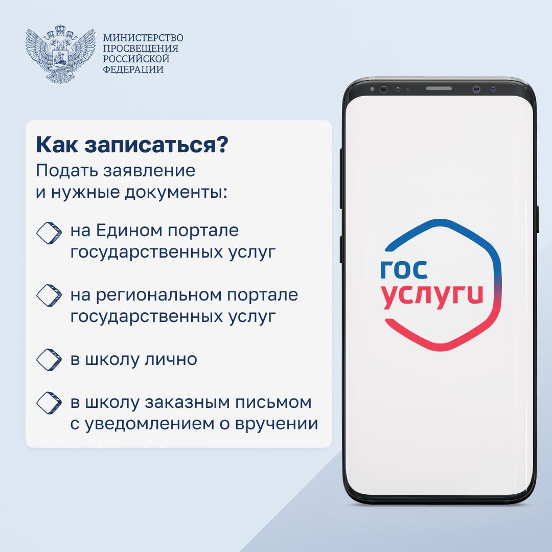 Родители вправе представить заявление и документы четырьмя способами: 1) в электронной форме через ЕПГУ; 2) через региональные государственные информационные системы (ГИС), связанные с ЕПГУ; 3) заказным письмом с уведомлением о вручении; 4) лично в школе.