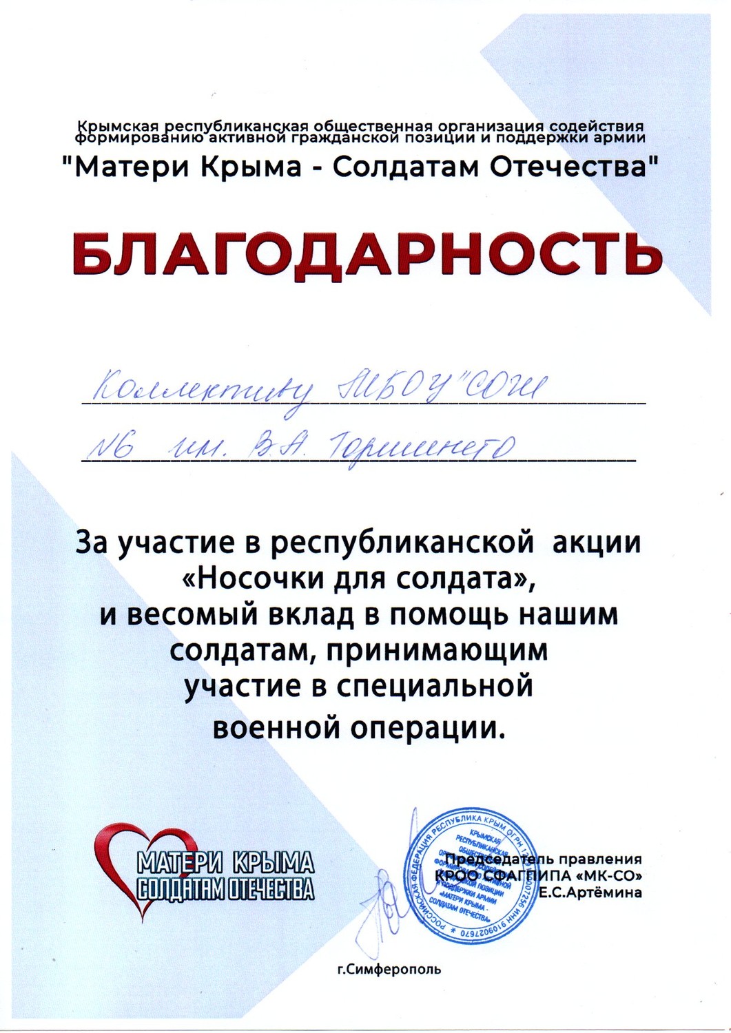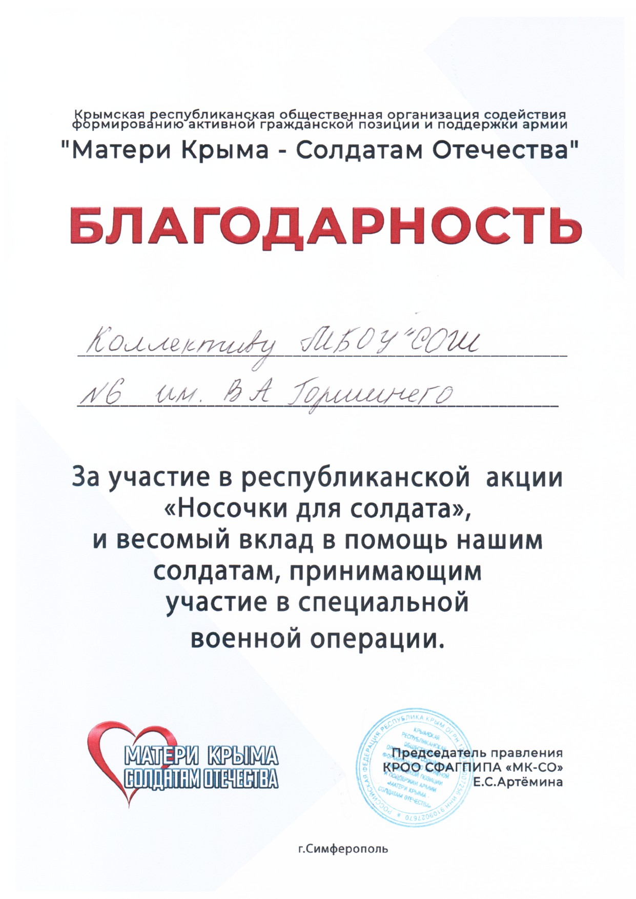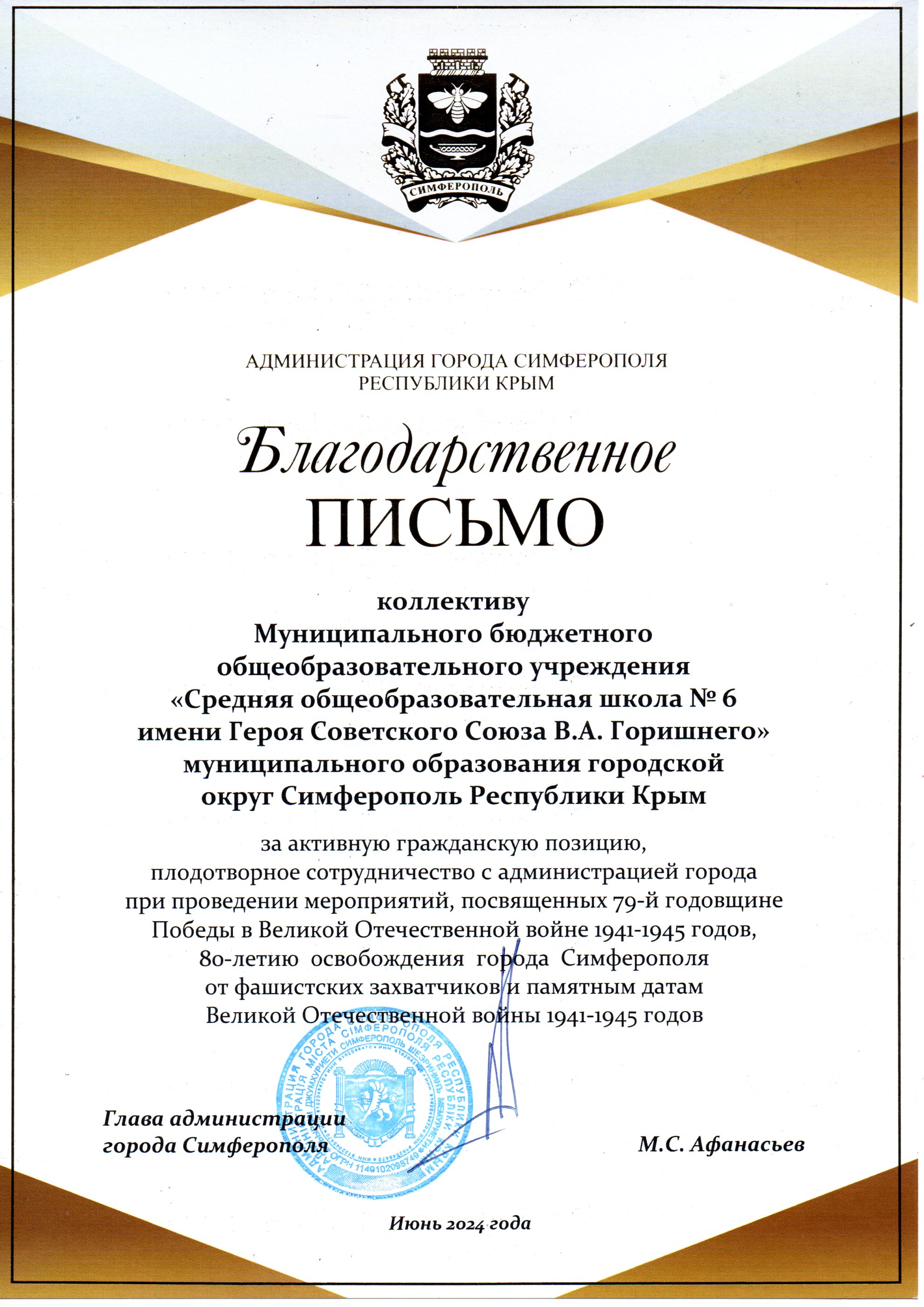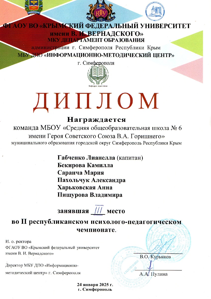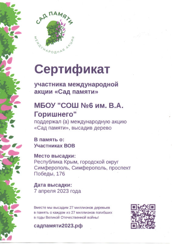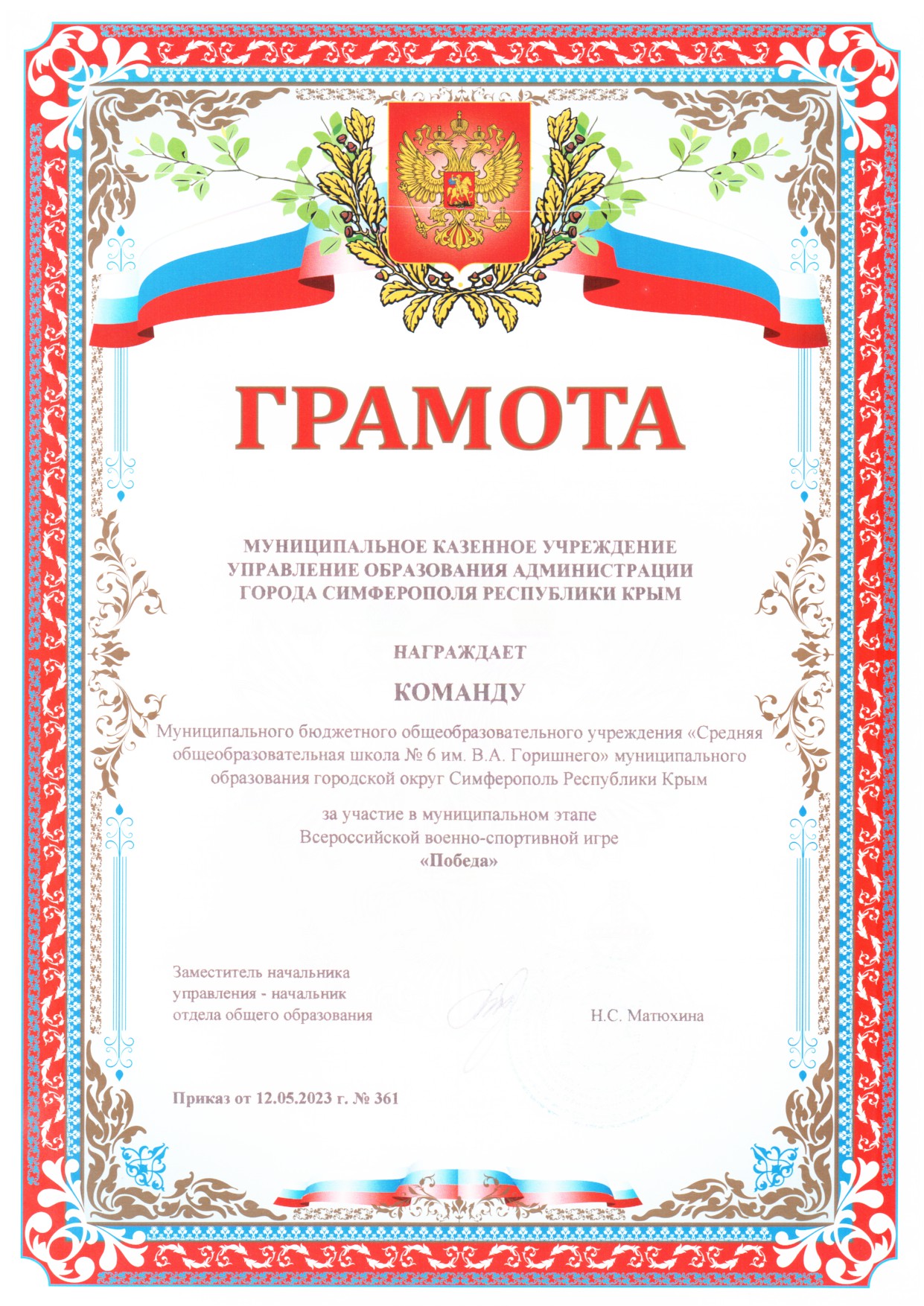 Муниципальное бюджетное общеобразовательное учреждение «Средняя общеобразовательная школа № 6 имени Героя Советского Союза В.А. Горишнего»