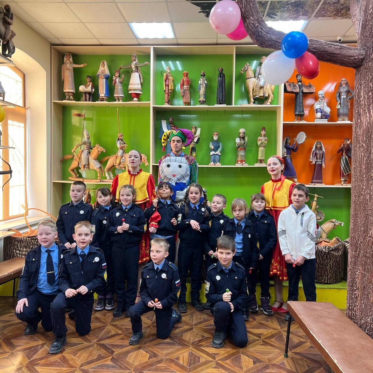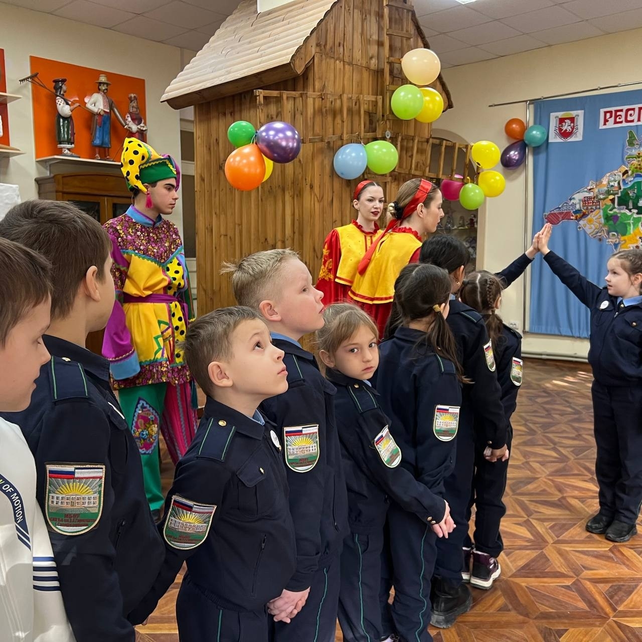 Ребят встретили задорные скоморохи, которые рассказали о традиции провожать Масленицу, звучали веснянки и заклички.