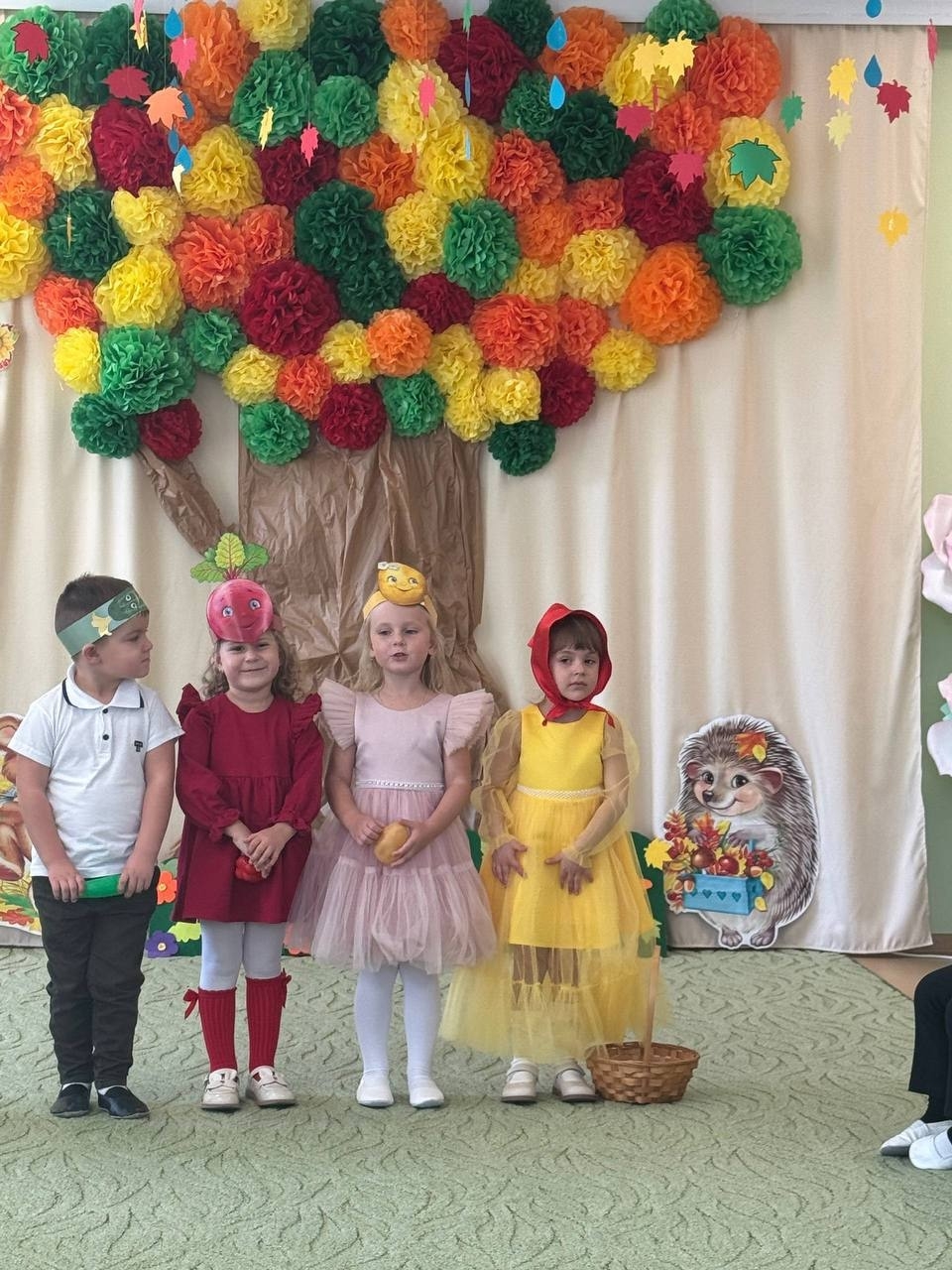 названием «Осень в гости к нам пришла». В зале царила теплая, доброжелательная атмосфера. Куда не посмотришь, везде дары осени: овощи, фрукты, грибы, ягоды. Герои нашего праздника: Слякоть, Баба-яга и Осень. Они не заставили себя долго ждать и