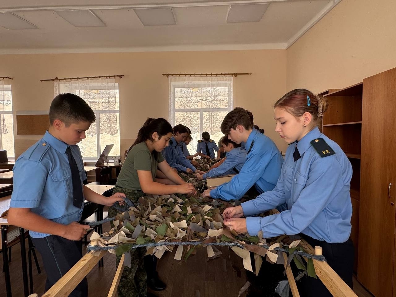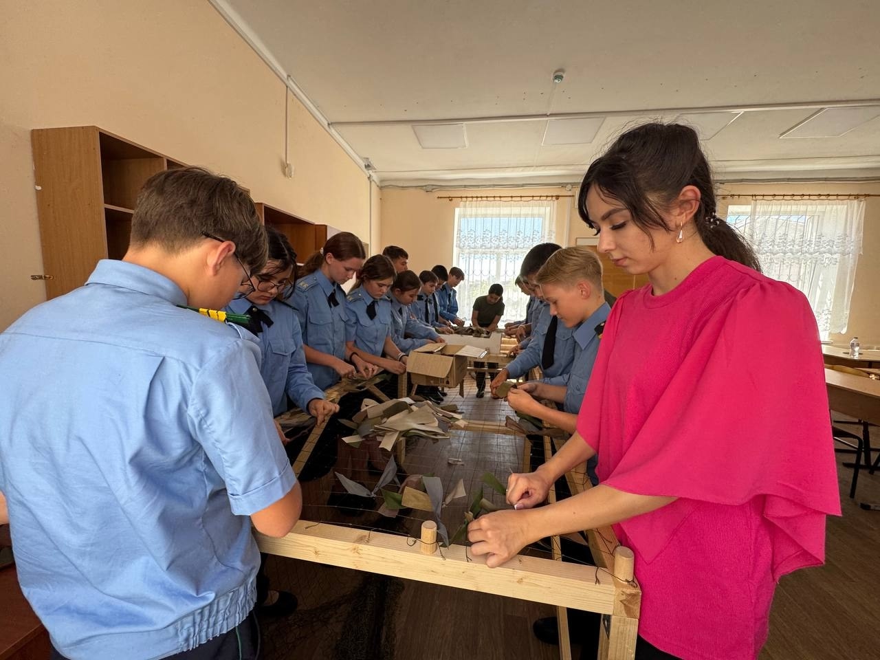 Ребята и учителя уже попробовали плести маскировочные сети.