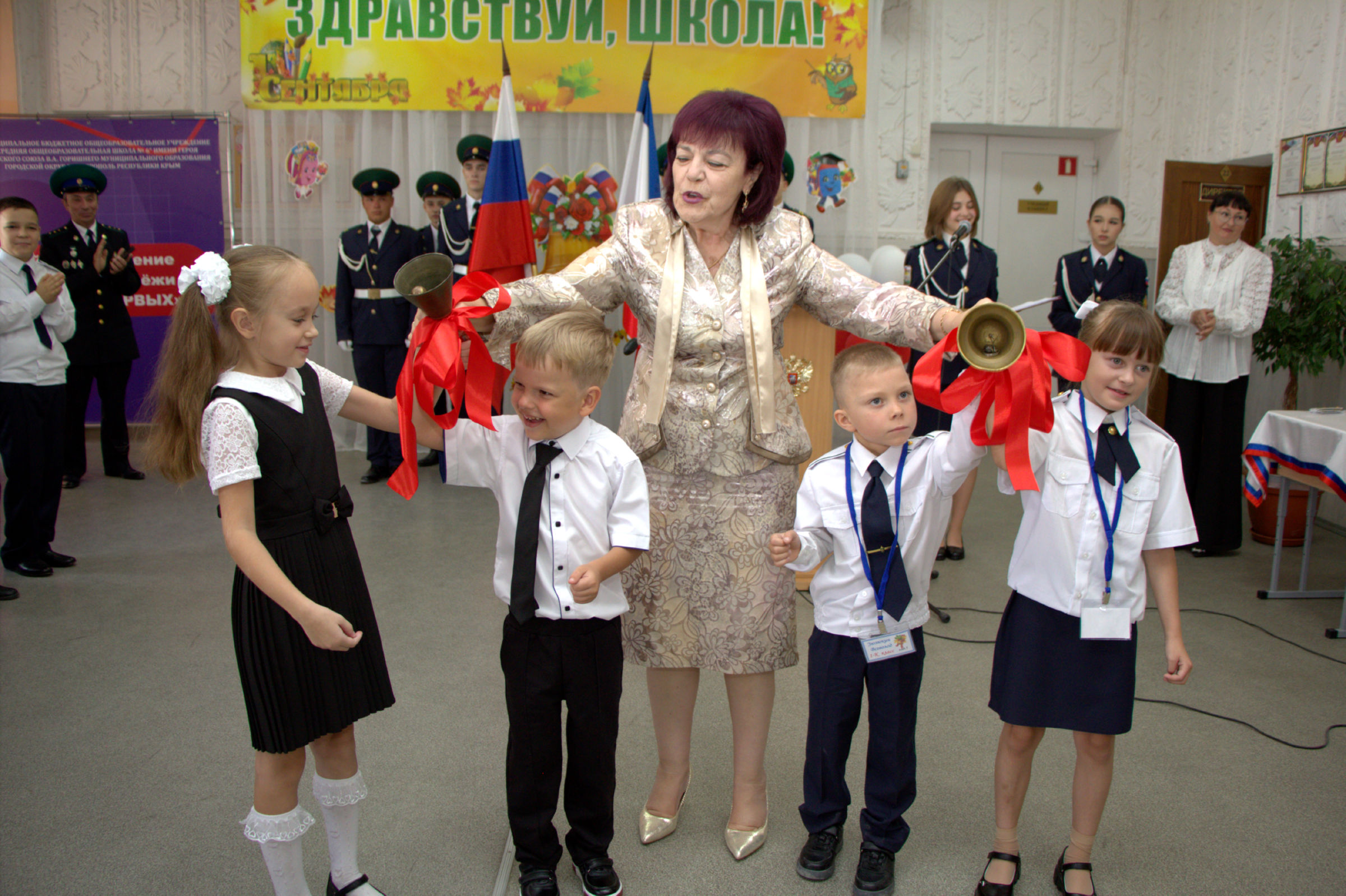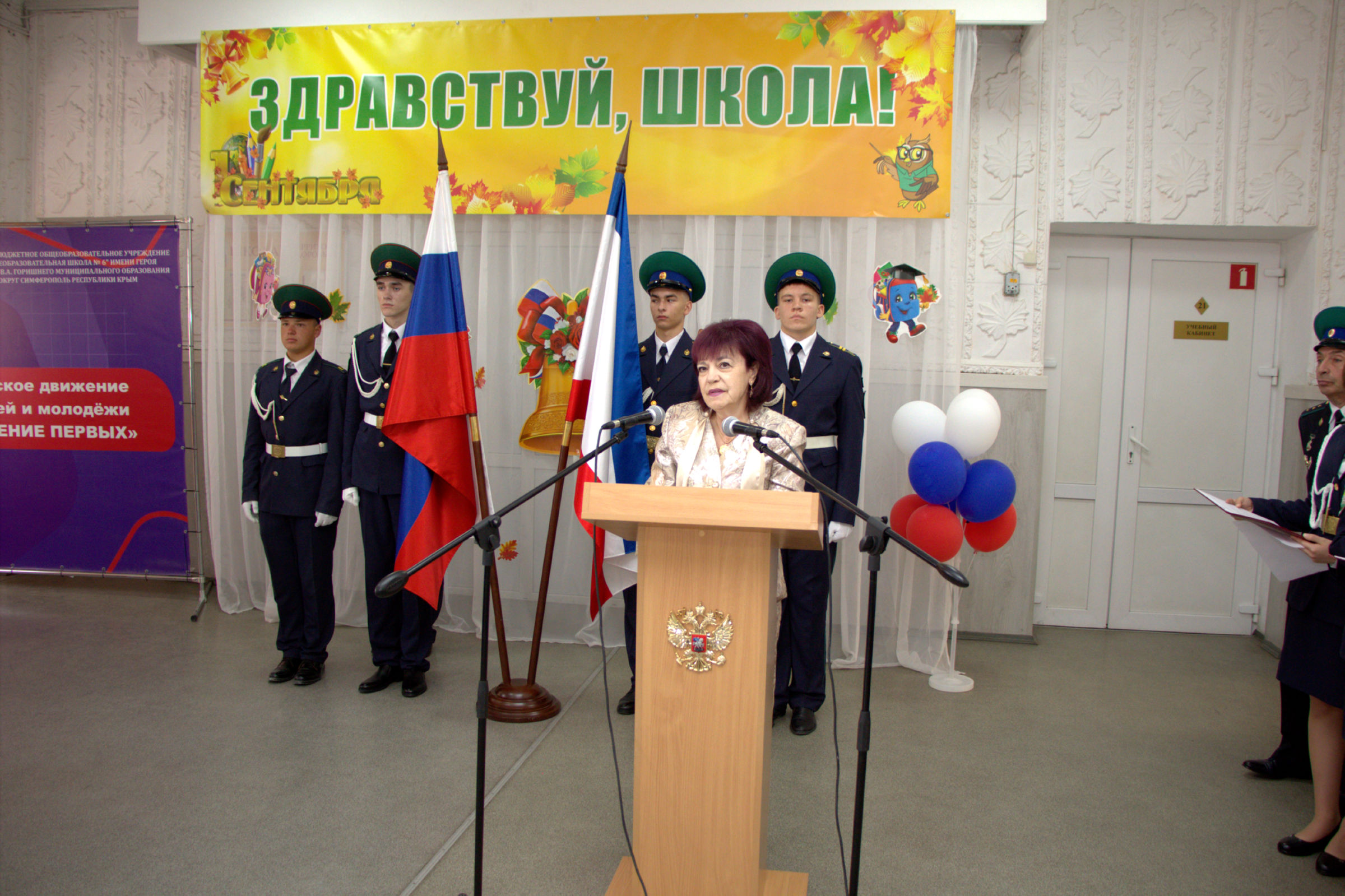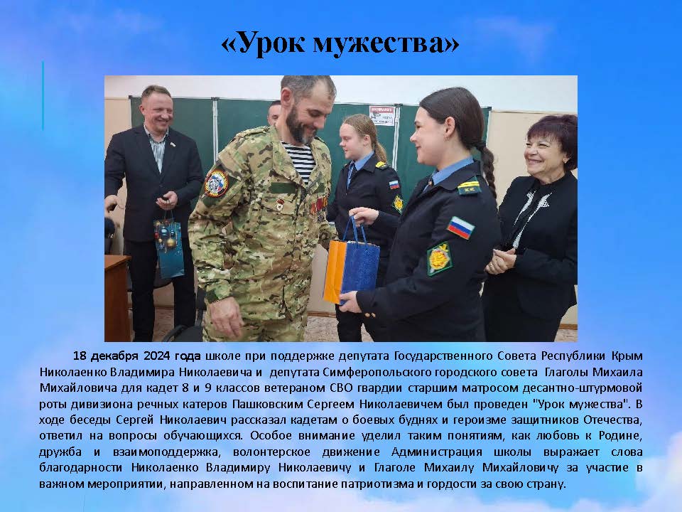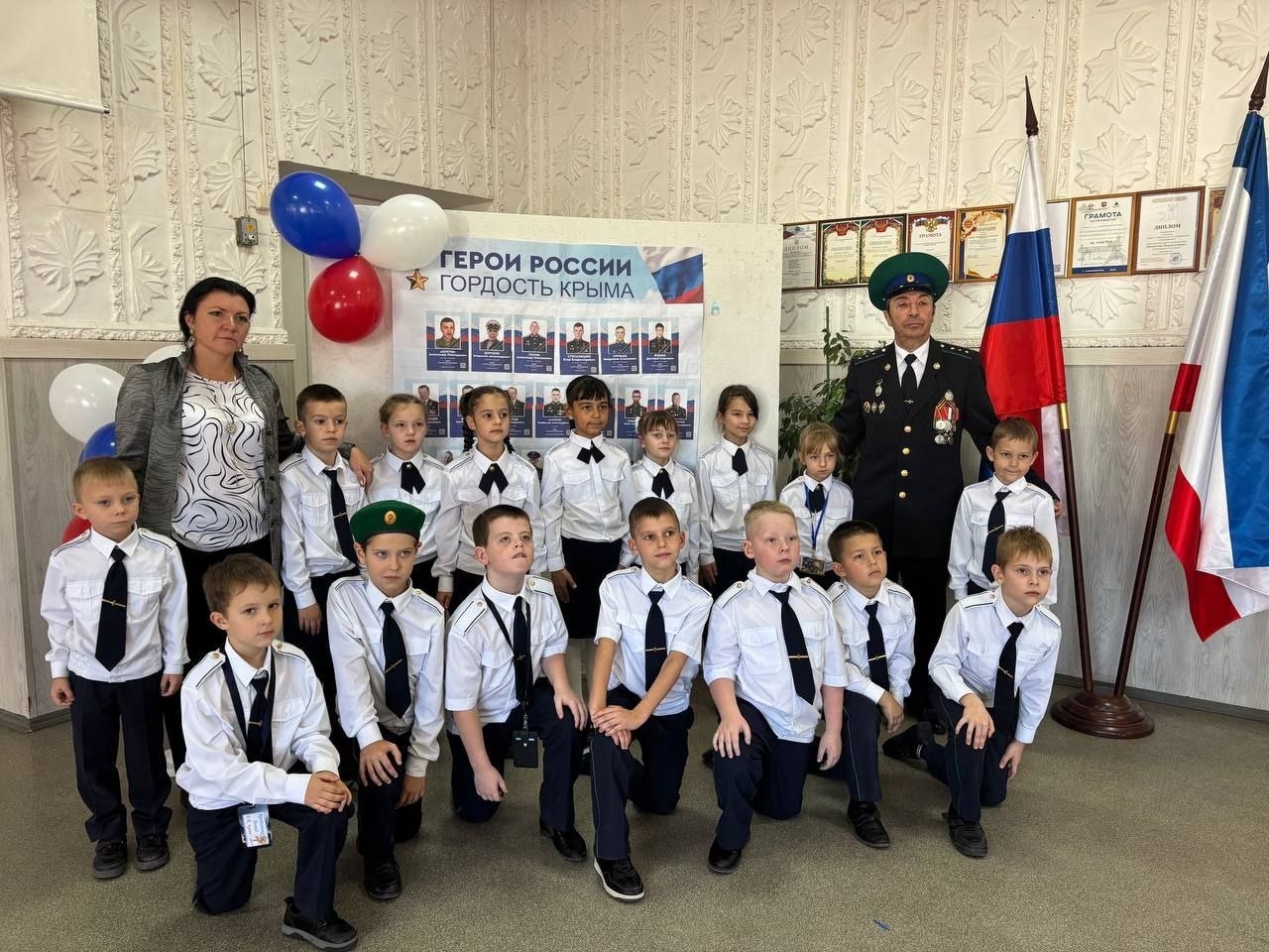 В нашей школе была проведена торжественная линейка, посвященная открытию стендов и старту акции "Герои России - Гордость Крыма". На празднике присутствовали почётные гости: член ветеранской организации воинов-пограничников Хромченко В. В. и участник СВО подполковник Савин В. В. Данный проект реализуется Министерством внутренней политики, информации и связи Республики Крым, АНО "Комитет семей воинов Отечества" Республики Крым, ветеранскими организациями.