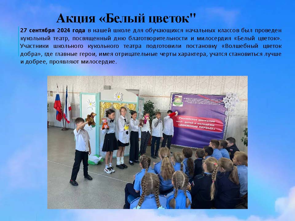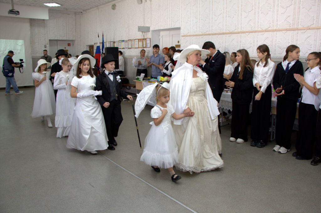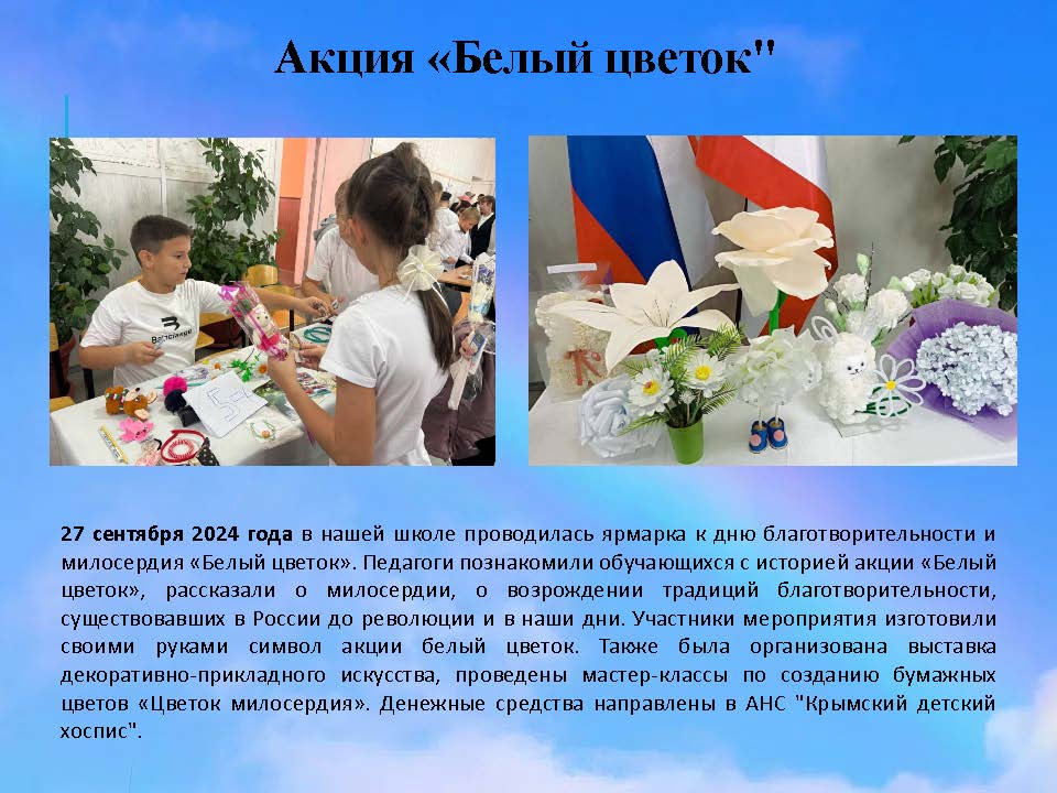 В школе были организованы праздничные мероприятия: выставка поделок, ярмарка, мастер-классы по изготовлению Белого цветка и дефиле костюмов.