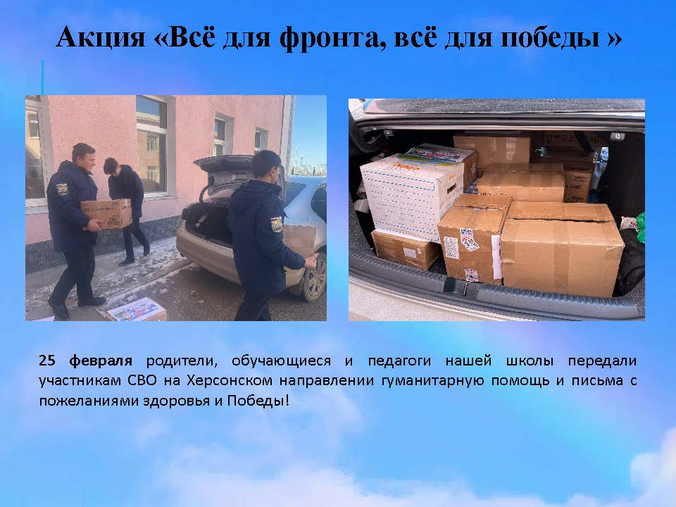 В рамках патриотического воспитания в нашей школе прошли акции "Новогодний привет из детства" и "Подарок Защитнику Отечества" по сбору гуманитарной помощи военнослужащим, которые принимают участие в зоне СВО. Родители, обучающиеся, воспитанники детского сада и их родители, педагоги с огромным желанием передали частицу домашнего тепла нашим защитникам. Зарядные устройств, грелки и термоноски, новогодние поздравления были переданы бойцам СВО. Акции были проведены при содействии Крымской республиканской общественной организации содействия формированию активной гражданской позиции и поддержки армии "Матери Крыма - Солдатам Отечества".