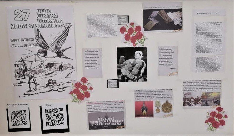 27 января отмечается одна из важнейших переломных дат в истории Великой Отечественной войны - полное освобождение Ленинграда от немецко-фашистской блокады. Блокада Ленинграда стала одним из самых тяжёлых испытаний для жителей города. Несмотря на все трудности жители Ленинграда проявили огромное мужество и силу духа. В нашей школе были проведены мероприятия, посвящённые этому памятному дню: акция "Блокадный хлеб", акция "Блокадная ласточка", классные часы. Члены школьного самоуправления оформили тематический стенд.